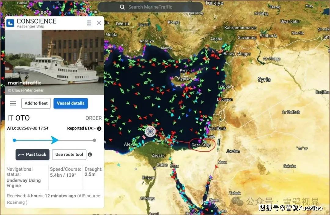 截至协调世界时UTC2025年10月7日20:52(北京时间10月8日早上4:52),舰队良心号位置在北纬32.045482度,东经30.980284度。