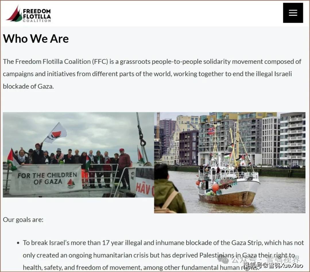 自由舰队联盟(the Freedom Flotilla Coalition,FFC)成立于2008年,是一个草根民间组织,由来自世界各地的运动和倡议组成,共同努力结束以色列对加沙的非法封锁。在成立之后的17年里,已经发起了数十次任务,旨在提供援助并引起全球对以色列围困加沙地带人道主义危机的关注。