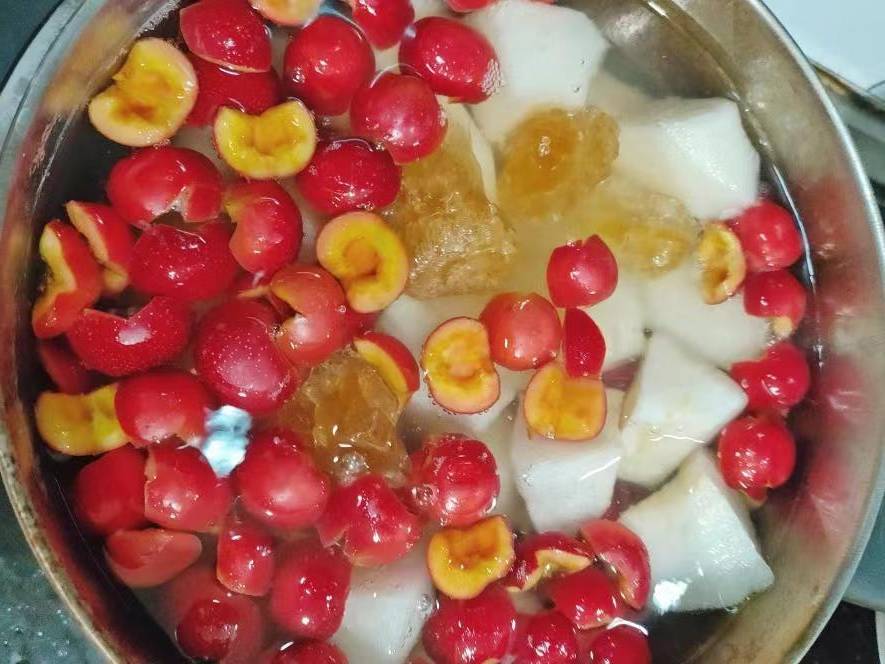 3、全都倒在锅里,加水加冰糖,大火先煮到沸腾,火候调整下,咕嘟半小时,果实都煮透后,即可关火。酸甜爽口的汤汁,甘润去燥,秋天里可以经常喝。
