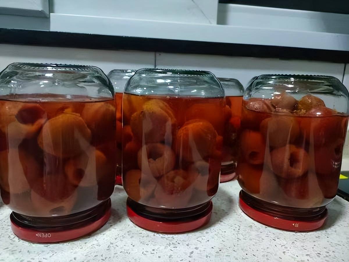 4、处理完后就简单了,将其分别装到罐头瓶里,加入一半的白开水,再分别放一把冰糖,放到蒸锅里,盖子不用拧,直接放到口上就可以。大火蒸十五分钟即可。之后趁热拿出来,此时要用湿毛巾垫着,一手托着盖子一手倒扣拧紧。这样就密封好了。当然随吃随开,酸甜可口特美味。