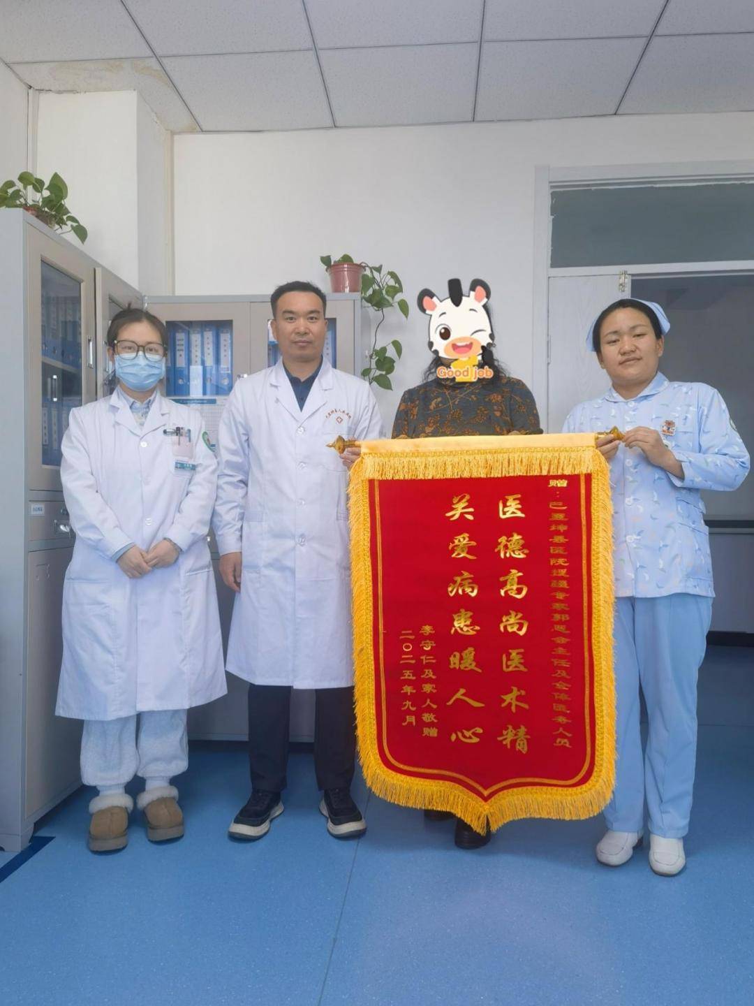 2025年9月26日上午,郭恩会主任在业务查房时,收到了一份特殊的致意——此前救治的高龄患者女儿在父亲完全康复后,专程从宁夏驱车赶来,将一面锦旗送至恩人手中。紧握郭恩会主任的双手哽咽道:“您是我父亲的救命恩人!没有您的果断决策和精心治疗,他可能无法平安回家……”质朴的言语背后,是家属对援疆专家及巴里坤县医院救治能力的深切认可。