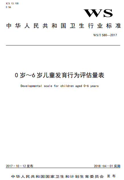 4. 国家卫生行业标准《WS/T 580—2017 0岁~6岁儿童发育行为评估量表》