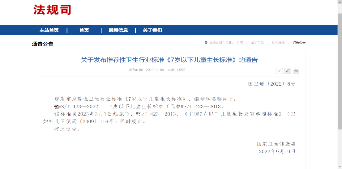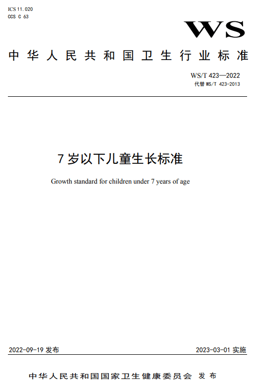 1. 国家卫生行业标准《WS/T 423—2022 7岁以下儿童生长标准》