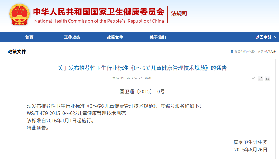为更好的促进《国家基本公共卫生服务规范》中---《0~6岁儿童健康管理服务规范》(以下简称“儿童规范”)的实施,陈博文研究员作为“儿童规范”起草及修订负责人,带领团队在总结项目前期实施经验及国内外研究成果基础上,组织相关专家、卫生行政管理人员、基层医疗卫生机构医护人员,经过多次论证,对“儿童规范”的内容进行了标准化,形成国家推荐性卫生行业标准《0~6岁儿童健康管理技术规范》(WS/T 479-2015)(以下简称“儿童标准”),为“儿童规范”的执行提供了标准支持。