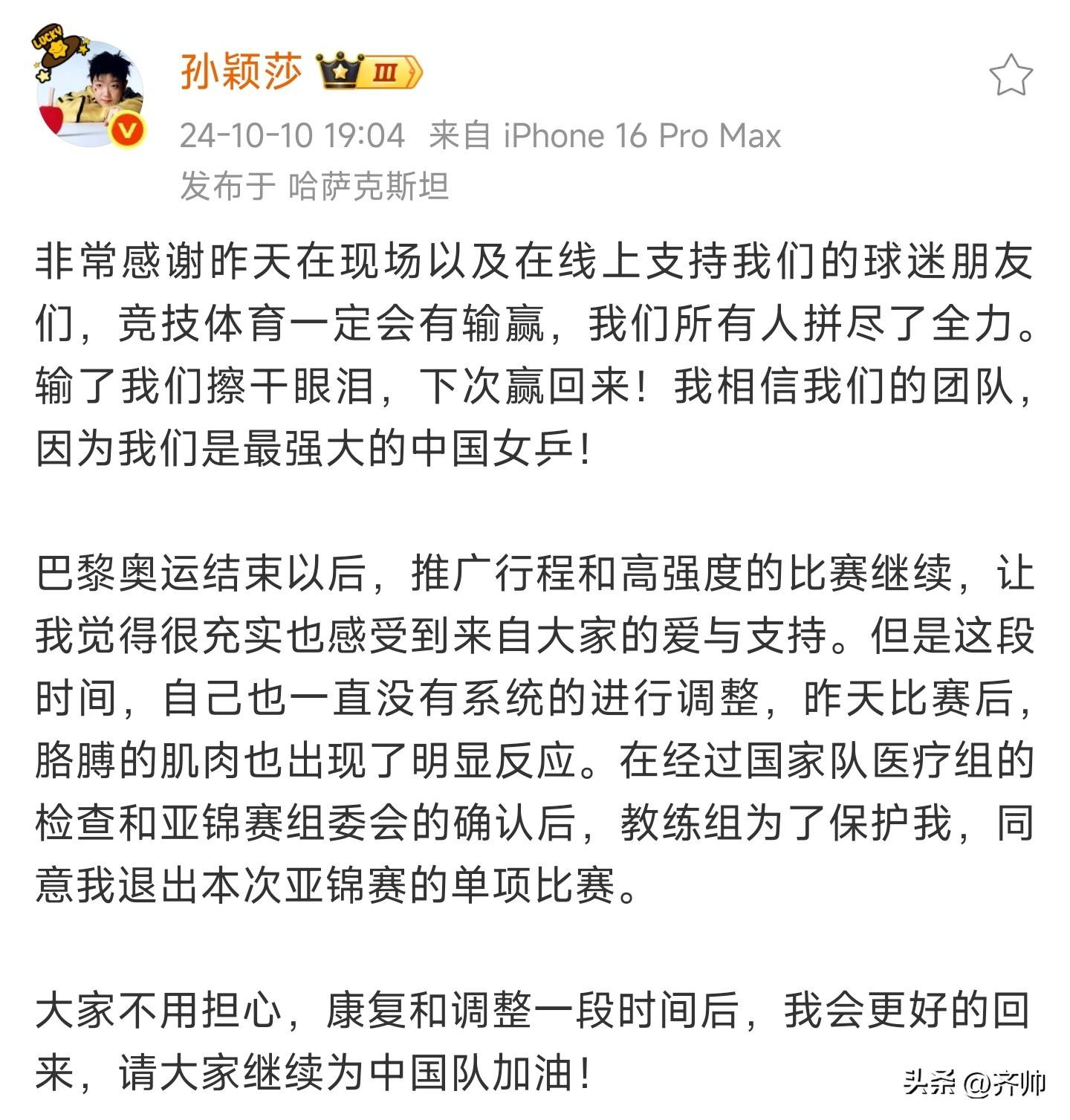 亚锦赛在阿斯塔纳开打,王楚钦对阵当时只有15岁的伊朗小将法拉吉,结果落败。孙颖莎领衔的女团则不敌日本队,颁奖仪式上国乒女队员的神情显得有些失落。更让人担心的是,孙颖莎在比赛中已经支撑不住,10月10日她发文宣布因伤病需要休整,退出比赛。