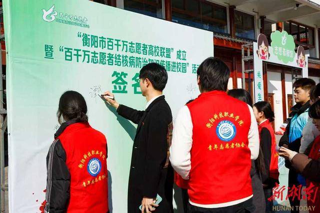 2024年12月15日,由市卫健委、共青团衡阳市委主办的“衡阳市结核病防治高校志愿者联盟”成立仪式在雁峰区举行,现场为11支高校志愿者团队授旗。联盟成立后,迅速启动“结核防治知识传播行动进校园”活动,通过“线上+线下”融合的方式,让防治知识“走进”校园每个角落:线上依托微博、抖音、微信公众号等平台,发布科普文章、动画视频;线下则通过开展专题系列宣讲,在图书馆、运动场、食堂、宿舍等公共区域设置志愿者服务岗宣传点等,营造浓厚的宣传氛围。
