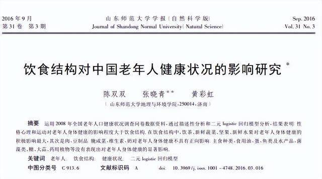 [1] 陈双双.饮食结构对中国老年人健康状况的影响研究, 山东师范大学学报(自然科学版), 2016-09-15