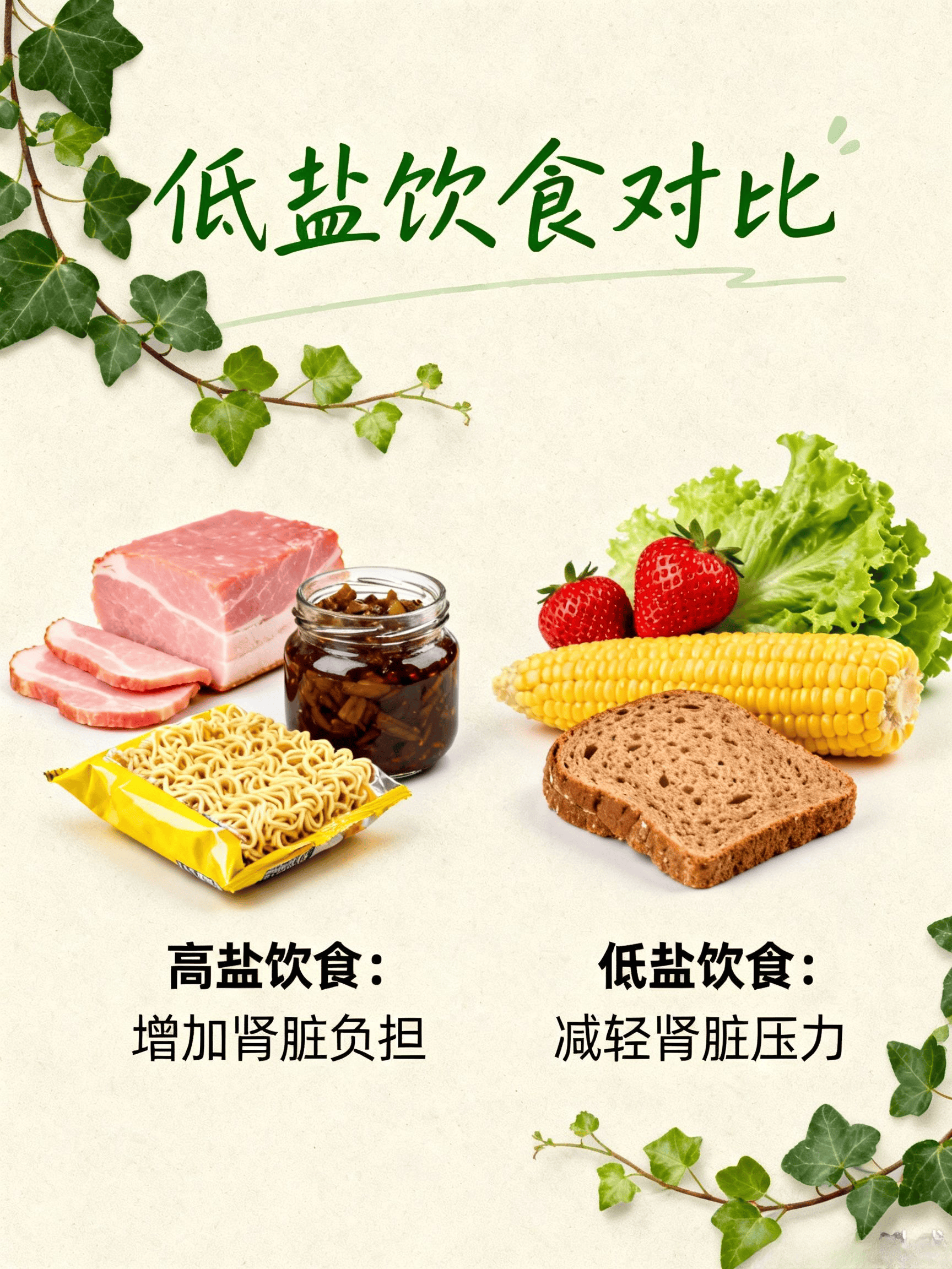 - 低盐饮食:世界卫生组织建议每日盐摄入量<5克,但我国居民平均每日盐摄入量达10.5克!高盐饮食会加重肾脏负担,诱发高血压性肾病。