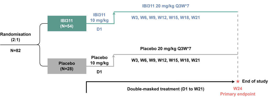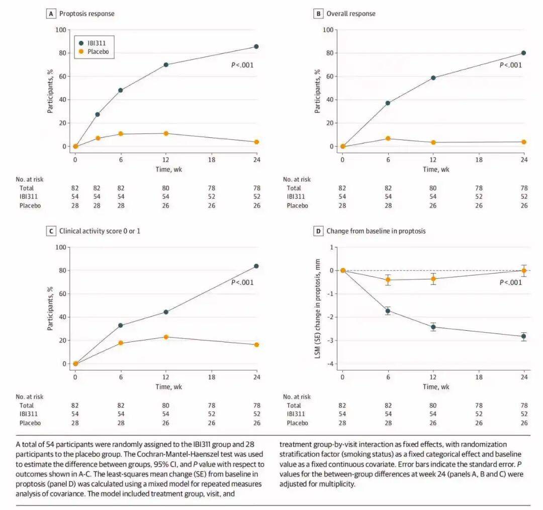研究结果显示,IBI311组眼球突出回退应答率显著高于安慰剂组。第24周时IBI311组和安慰剂组的眼球突出回退应答率分别为85.8%和3.8%,率差达81.9%(95% CI: 69.8, 93.9; P<0.0001)。关键次要终点中,第24周时研究眼的眼球回退总应答率、CAS为0或1的受试者比例和眼球突出度较基线改变,IBI311组均显著优于安慰剂组(P<0.0001)。