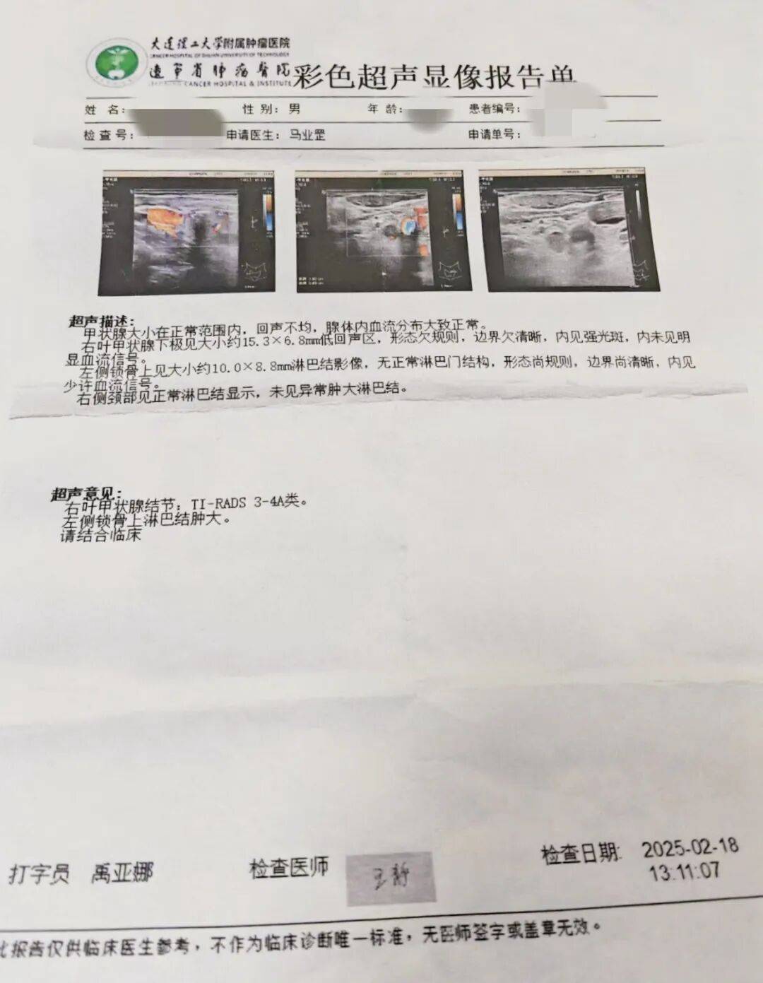 人生像一趟没有返程的列车,总在不经意间遭遇急弯。两年前,胃癌手术的创伤还没完全抚平,刘先生以为终于能喘口气,好好享受三餐安稳,可2025年5月的一张报告,又将刘先生推向绝望边缘,甲状腺彩超上“15.3×6.8mm结节”“T1-RADS 3~4A类”的字样格外刺眼,穿刺病理更明确写着“乳头状癌”,冰冷的诊断像一块巨石,压得刘先生喘不过气。