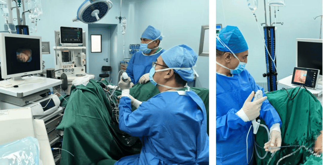 左图:当地医师阿布都力克木作为助手参与负压鞘联合软镜碎石术;右图:当地医师阿布都力克木独立进行手术操作