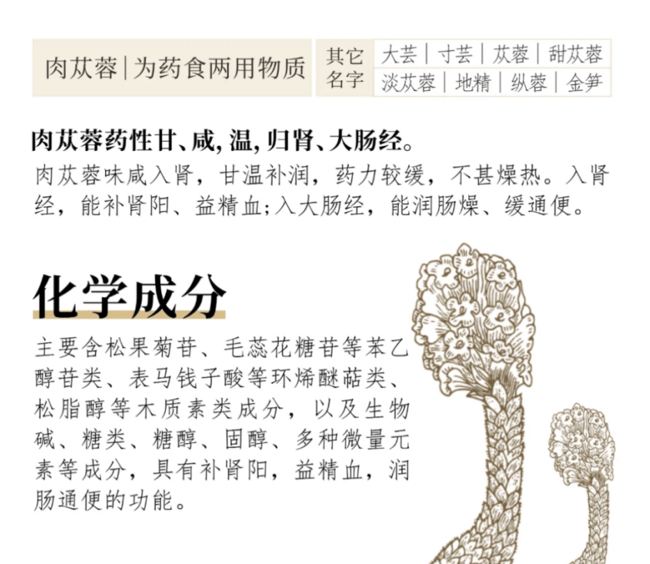 现代研究显示,肉苁蓉含多糖、氨基酸、甾体化合物等有效成分,可促进肾脏细胞修复再生,调节内分泌,增强免疫力。它对男性睾丸功能有保护作用,提升精子活力,延缓衰老;对女性则调节月经周期,增强卵巢功能,改善更年期症状。