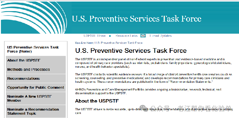 USPSTF ( U.S. Preventive Services Task Force,美国预防服务工作组 )成立于 1984年,是其国内预防和循证医学专家的独立组织,通过循证医学成果提供临床预防服务(如筛查、咨询或预防性用药)来促进美国人的健康。