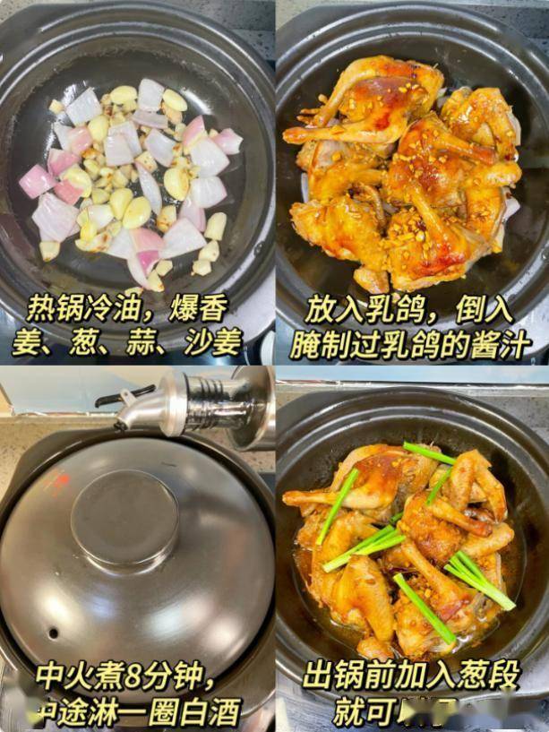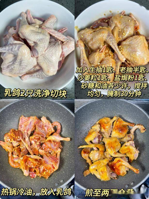 材料:2只乳鸽,1勺生抽,老抽,沙姜粒,盐焗鸡粉,白糖,食用油,葱姜蒜,葱段。