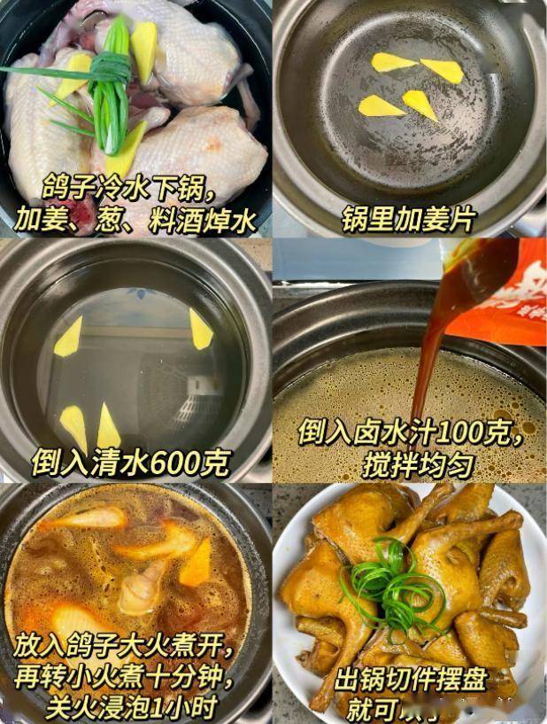 材料:适量鸽子,生姜,葱花,料酒,清水,卤水汁。