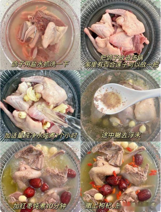 材料:一只鸽子,百合莲子,红枣,枸杞,盐。