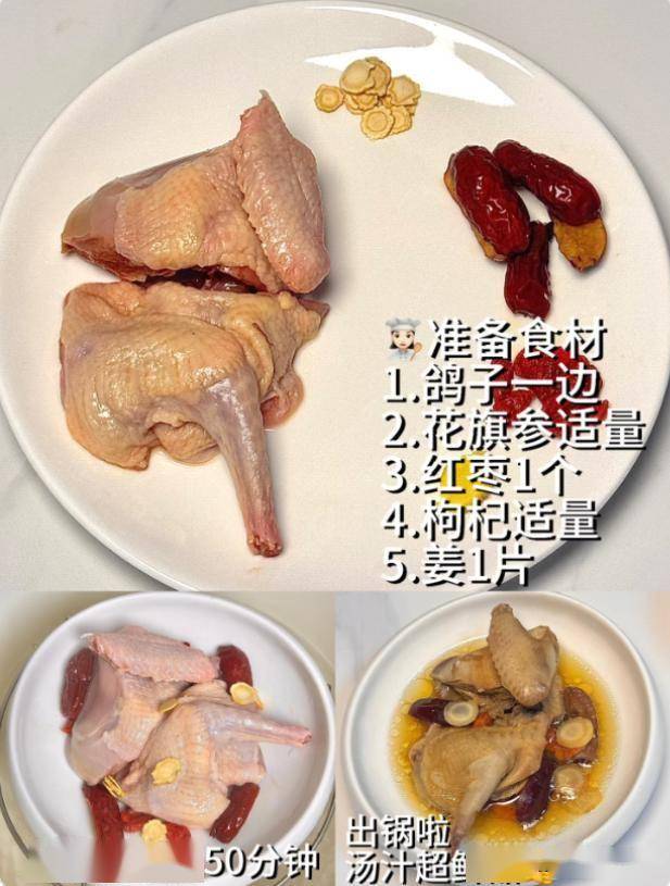 材料:一只鸽子,花旗参,红枣一个,一小把枸杞,1片生姜。