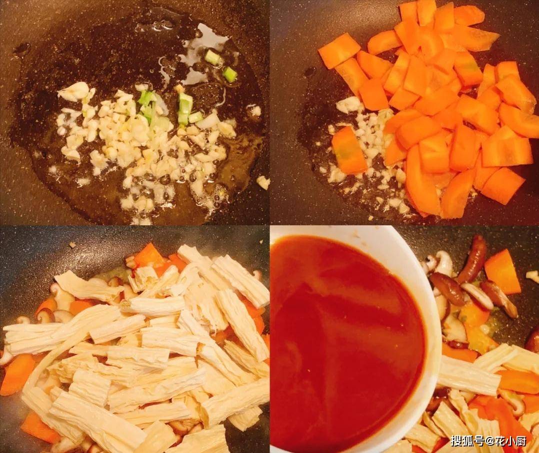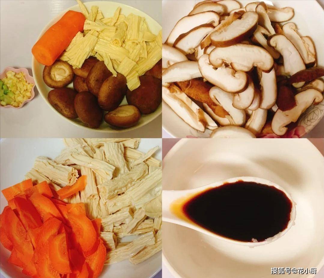 食材:腐竹、半根胡萝卜、五朵香菇、三瓣蒜就行。