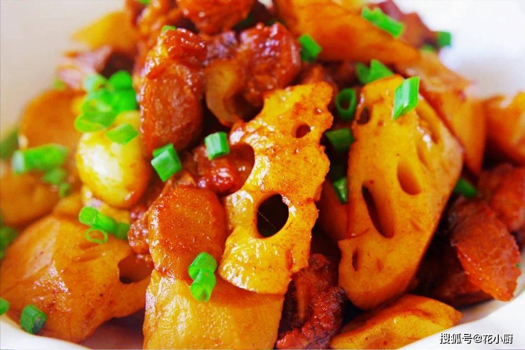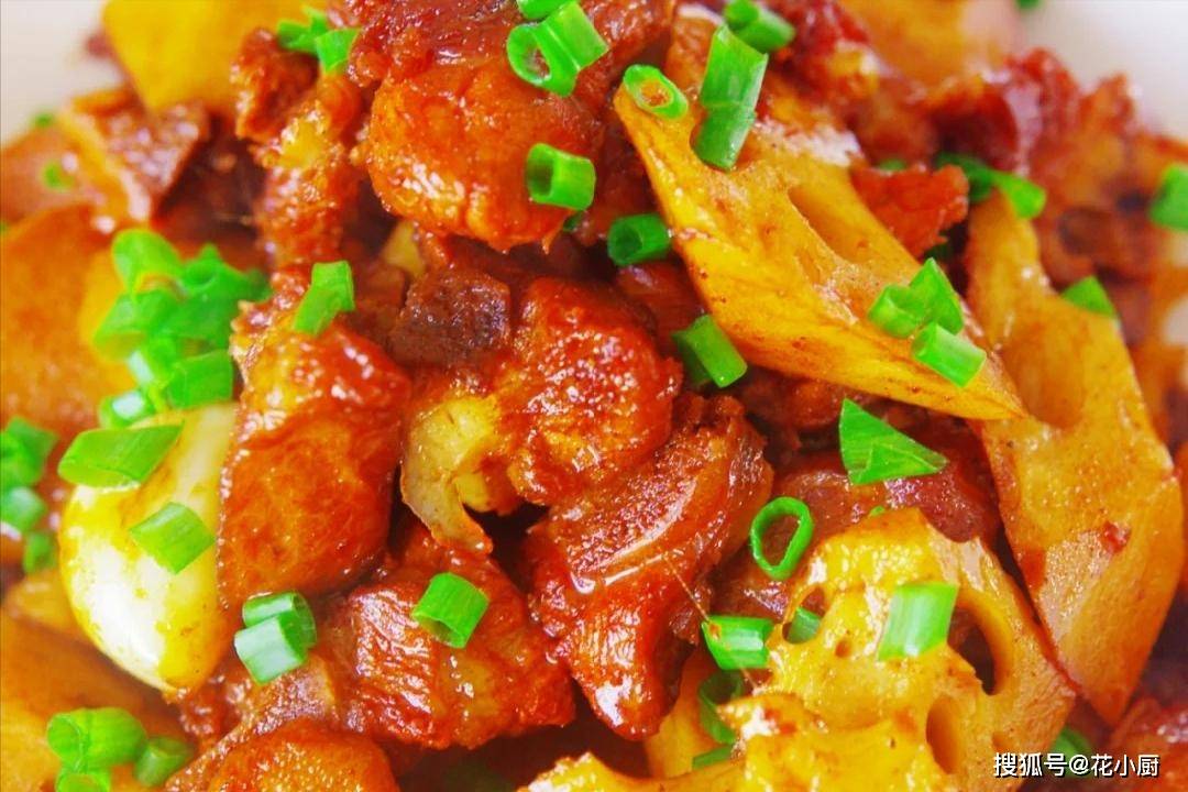 6、6把火开大,让汤汁快速收一收。看着汤汁一点点变少,紧紧地裹在排骨和莲藕上,这道菜就算大功告成啦!把菜盛到盘子里,再撒上一把葱花;这道红烧排骨炖莲藕,排骨喷香入味,莲藕清甜爽脆,一口排骨,一口莲藕,那滋味,简直美到心窝窝里去了。