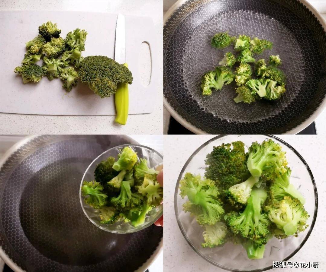 3、西兰花把根部去掉,等水开了,把西兰花放进去焯一下,然后捞出来过过凉水,再把水沥干。