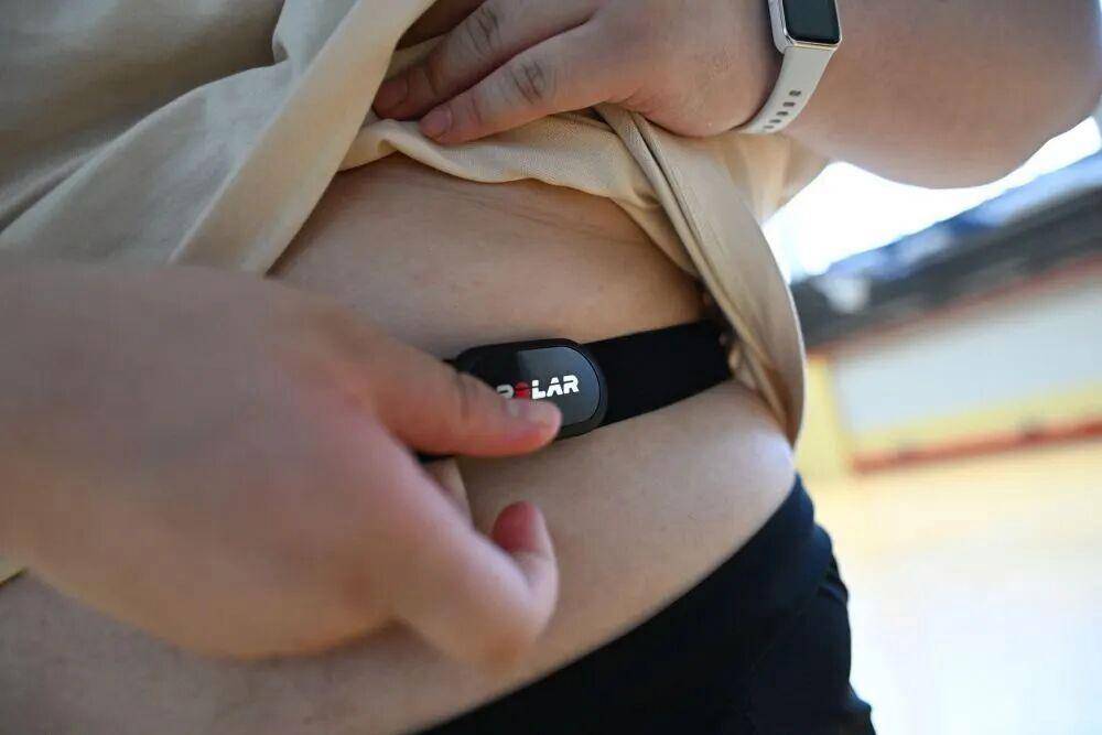 参加减脂课的学生在训练前佩戴心率带。新华社记者 陈钟昊 摄