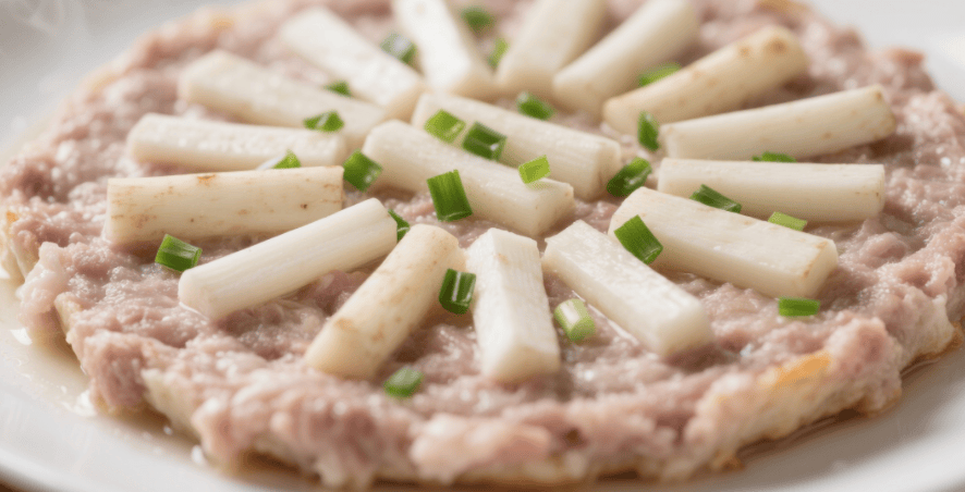 把肉糜在盘子里摊成肉饼的模样,上面均匀地摆上山药段,