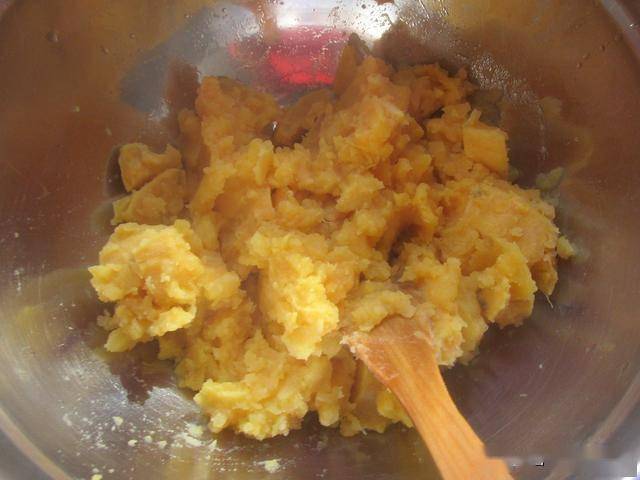 第一步:地瓜蒸熟后去皮,全部放入盆中,直接加入适量的糯米粉,搅拌均匀。