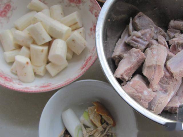 第一步:把山药去皮,切成块备用,排骨放入冷水中加入料酒烧开,去掉杂质,去掉腥味。