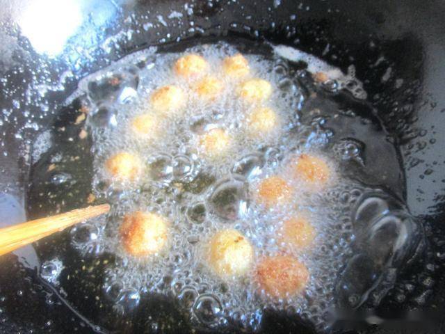 第三步:锅里放入适量的花生油,烧至7成热,把做好的地瓜球放入,中小火炸至飘起来,呈金黄色,用漏勺捞出控油即成。