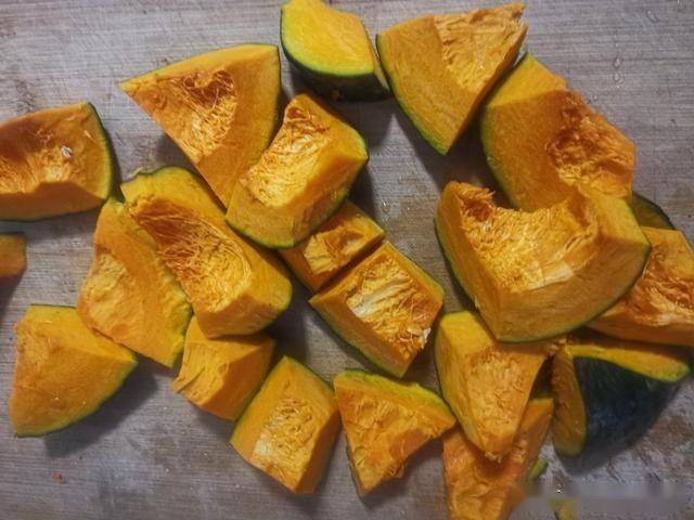 第一步:把南瓜切成小块,南瓜最好选择口感甜、面的品种,这样做出的南瓜汤味道最好。
