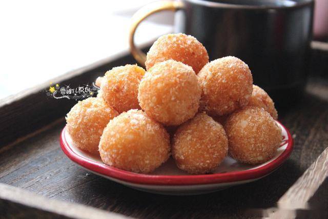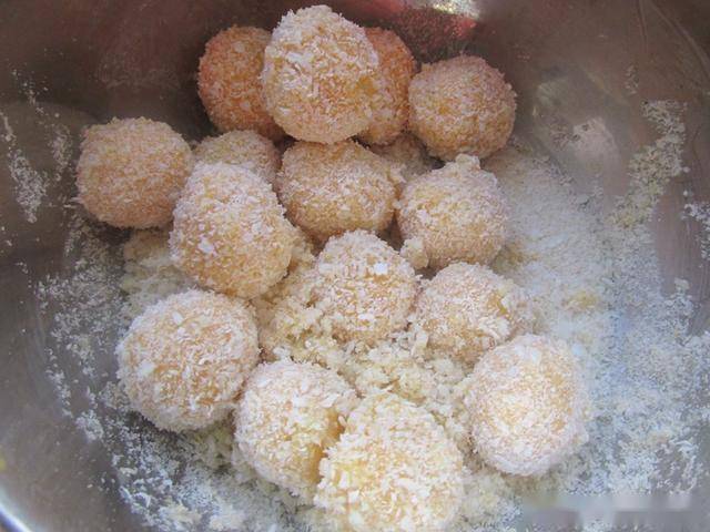 第二步:面团分割成大小一致的小剂子,拿一块按扁,放上奶酪,收口后团成圆球,表面蘸上鸡蛋液,再放到面包糠中均匀的滚上面包糠。