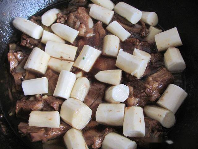 第二步:锅里放入适量的花生油,放入葱段、姜片、花椒、八角爆香,倒入排骨煸炒均匀,炒至排骨微微发黄,加入酱油翻炒均匀,加入开水,大火烧开,改成小火慢慢炖约40分钟,加入适量的盐和山药继续小火慢炖至汤汁变少,出锅即成。