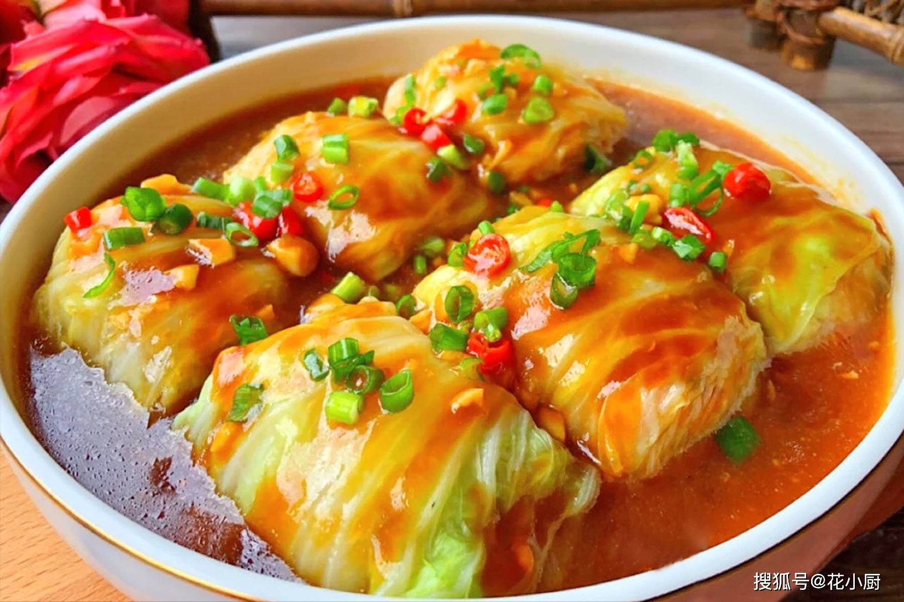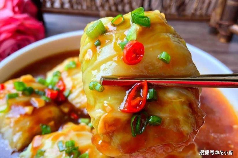 6、12 分钟一到,赶紧把蒸好的白菜包肉从蒸锅里拿出来。把勾好的芡汁均匀地浇在白菜卷上面,再撒上葱花。哇塞,一道美味的白菜包肉就做好啦!这白菜包肉不仅味道好,寓意也特别好,就像把满满的幸福都包在里面一样。