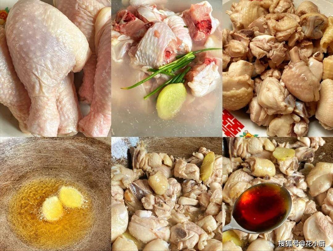 2、锅里倒点油,把姜片和蒜末放进去,用小火慢慢炒。等姜片和蒜末炒出香味后,把洗好的鸡块倒进锅里,开大火翻炒。这时候你就使劲儿翻,大概炒个 5 分钟,鸡肉表面就有点微微变色了。