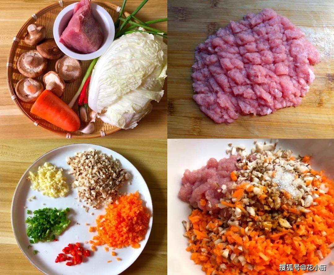 1、先把瘦肉洗得干干净净的,然后剁成肉末。接着把香菇也洗干净,切成小丁,胡萝卜去皮洗好也切成丁。蒜去皮切成末,葱洗净切成葱花,小米辣切成圈。