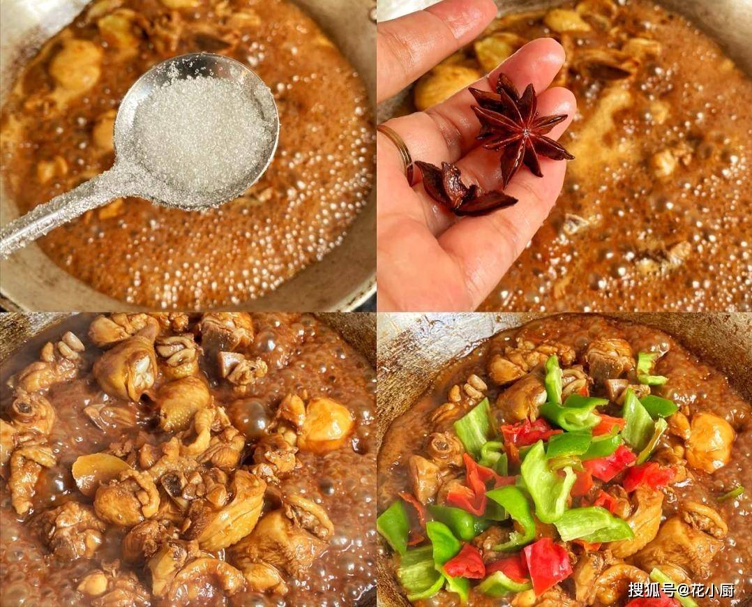 4、调料炒均匀后,咱往锅里倒适量的清水。这水不用太多,能没过鸡肉就行。再往水里加半勺白糖,还有适量的八角。盖上锅盖,焖煮个 5 分钟。