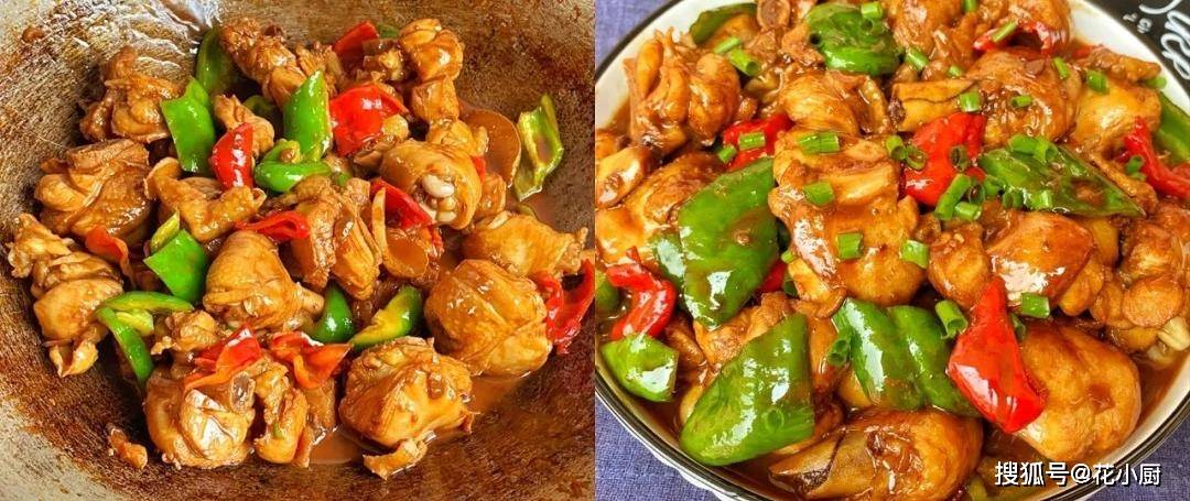 5、等时间一到,把切好的青红椒倒进去接着翻炒。青红椒在锅里和鸡肉一起翻滚,颜色变得更加鲜艳了。继续炒,把锅里的汤汁收一收。等汤汁变得浓稠,紧紧地裹在鸡肉和青红椒上,这道菜就大功告成啦。