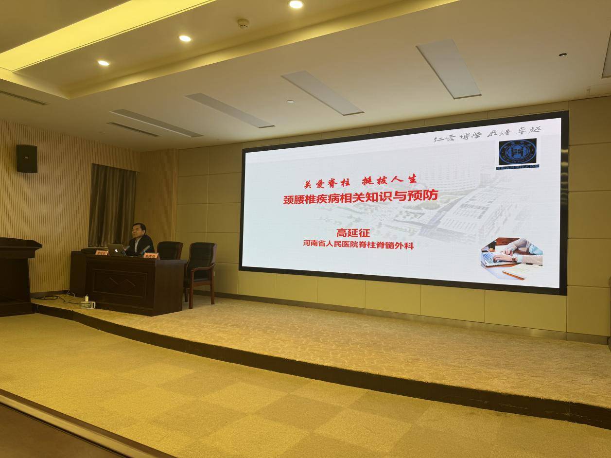 本次活动由河南省财政厅二级巡视员杨志强主持。大讲堂环节,主办方特邀了河南省人民医院首席专家、脊柱病中心高延征主任医师担任主讲。高主任没有进行枯燥的理论说教,而是紧密结合财政厅职工“伏案久坐、长时间面对电脑、精神压力大”等工作特点,用通俗易懂的语言和生动的案例,深入浅出地讲解了颈椎病、腰椎间盘突出的预防与保健、以及如何通过科学锻炼和微运动对抗颈腰椎疾病带来的社会、心理和生活问题。