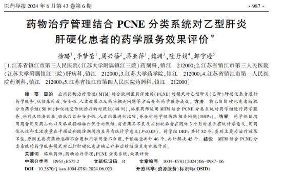 [1]徐璐.药物治疗管理结合PCNE分类系统对乙型肝炎肝硬化患者的药学服务效果评价,医药导报,2024-06-01