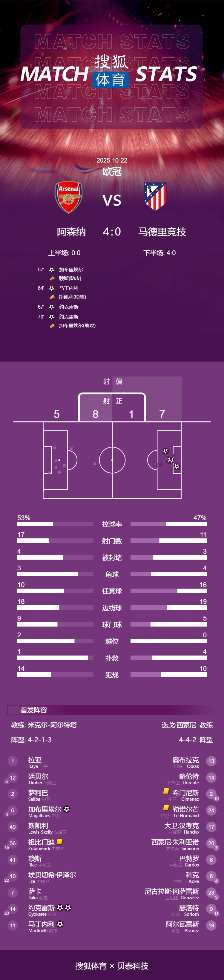 最终,阿森纳在主场4-0大胜马竞,取得欧冠三连胜。