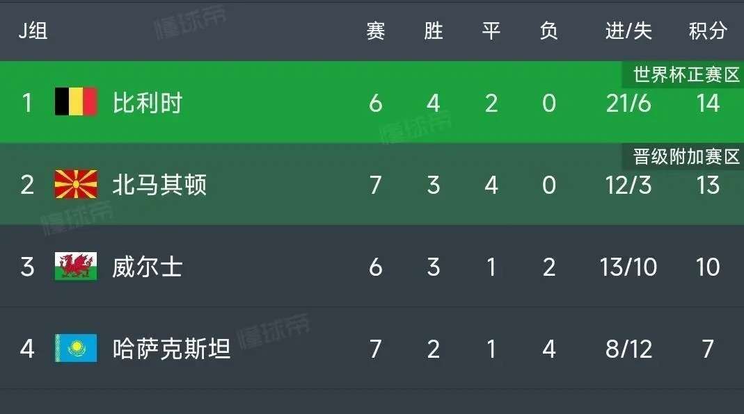 - J组:比利时14分领跑,威尔士10分位居第三。尽管“欧洲红魔”实现逆转取胜,但小组领先优势并不牢固。