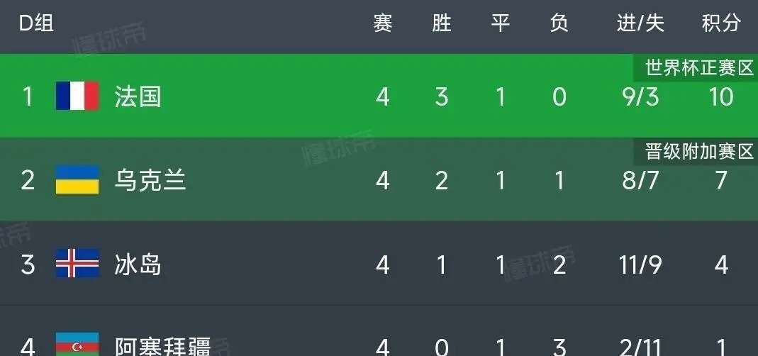 - D组:法国与冰岛同积10分,但以净胜球优势领先对手。