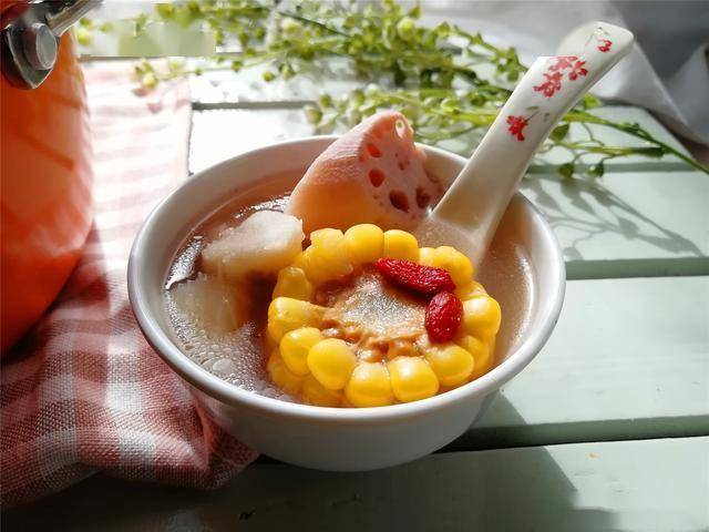 6.到时间后,下入玉米,莲藕,大火烧开,转小火,继续煮30分钟,到时间后,加入盐调味,关火,盛出即可,一锅美味又养生的汤就做好了。