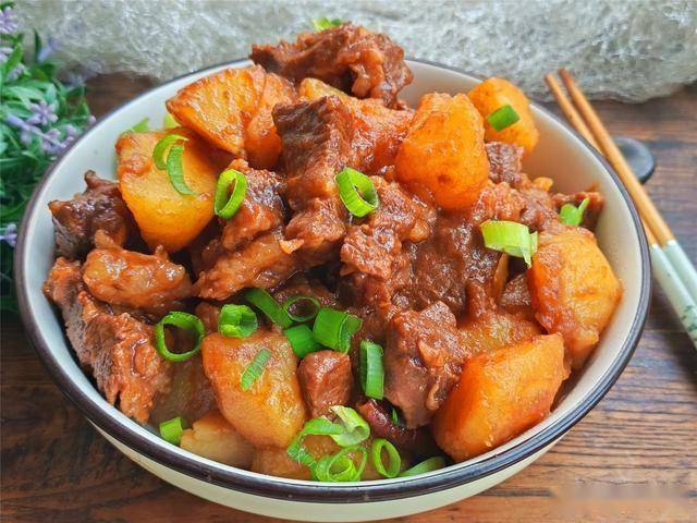 【牛肉炖土豆】所需材料:牛肋条肉1.5斤、土豆2个、油 盐适量、洋葱半个、姜1块、大料2个、香叶4-5片、干辣椒3-4个、生抽1汤匙、红烧酱油半汤匙、白糖半汤匙、料酒1汤匙、桂皮 一小块、白胡椒粉1茶匙、