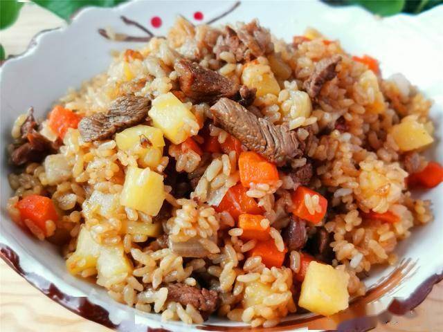 【羊肉焖饭】所需材料:大米适量、羊肉半斤、土豆1个、胡萝卜半根、洋葱半个、油盐适量、孜然粉1茶匙、姜2片、料酒半汤匙、红烧酱油半汤匙、生抽2汤匙、白胡椒粉1茶匙、孜然粉1茶匙、