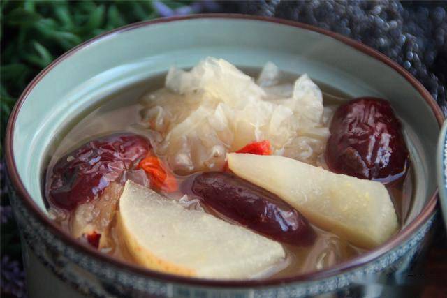 【雪梨银耳百合莲子羹】所需材料:雪梨2个、银耳半朵、百合15克、莲子20克、大枣6-7个、黄冰糖1块、枸杞10几粒、