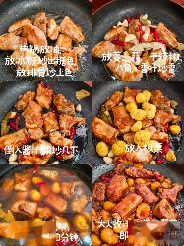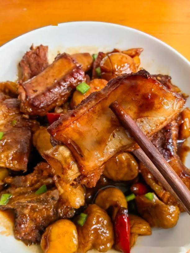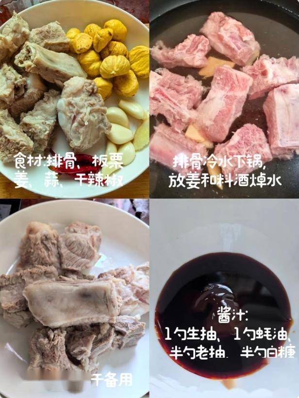 材料:适量排骨,适量板栗,适量大蒜末,适量小米辣,生抽,蚝油,老抽,白糖,葱花,八角,香叶。