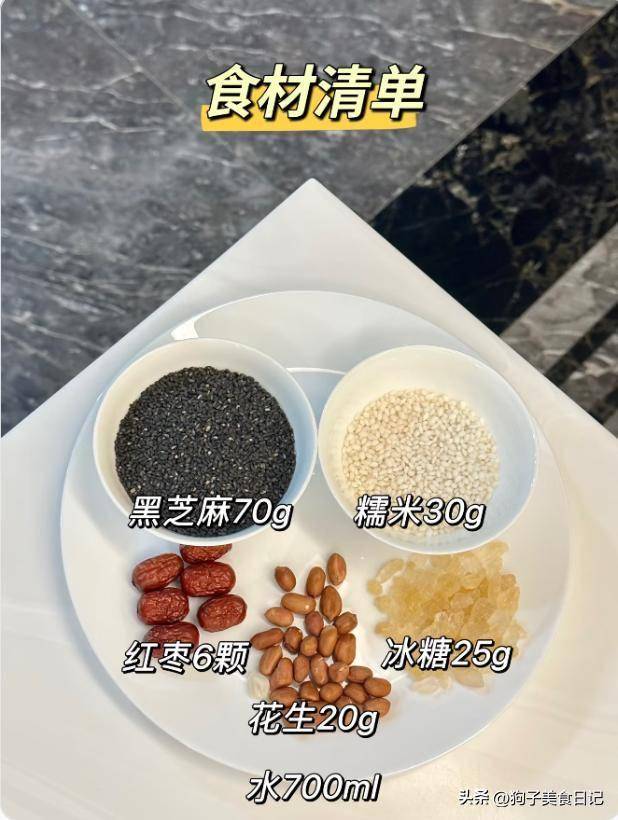 材料:芝麻70克,糯米30克,红枣,花生,冰糖,清水。