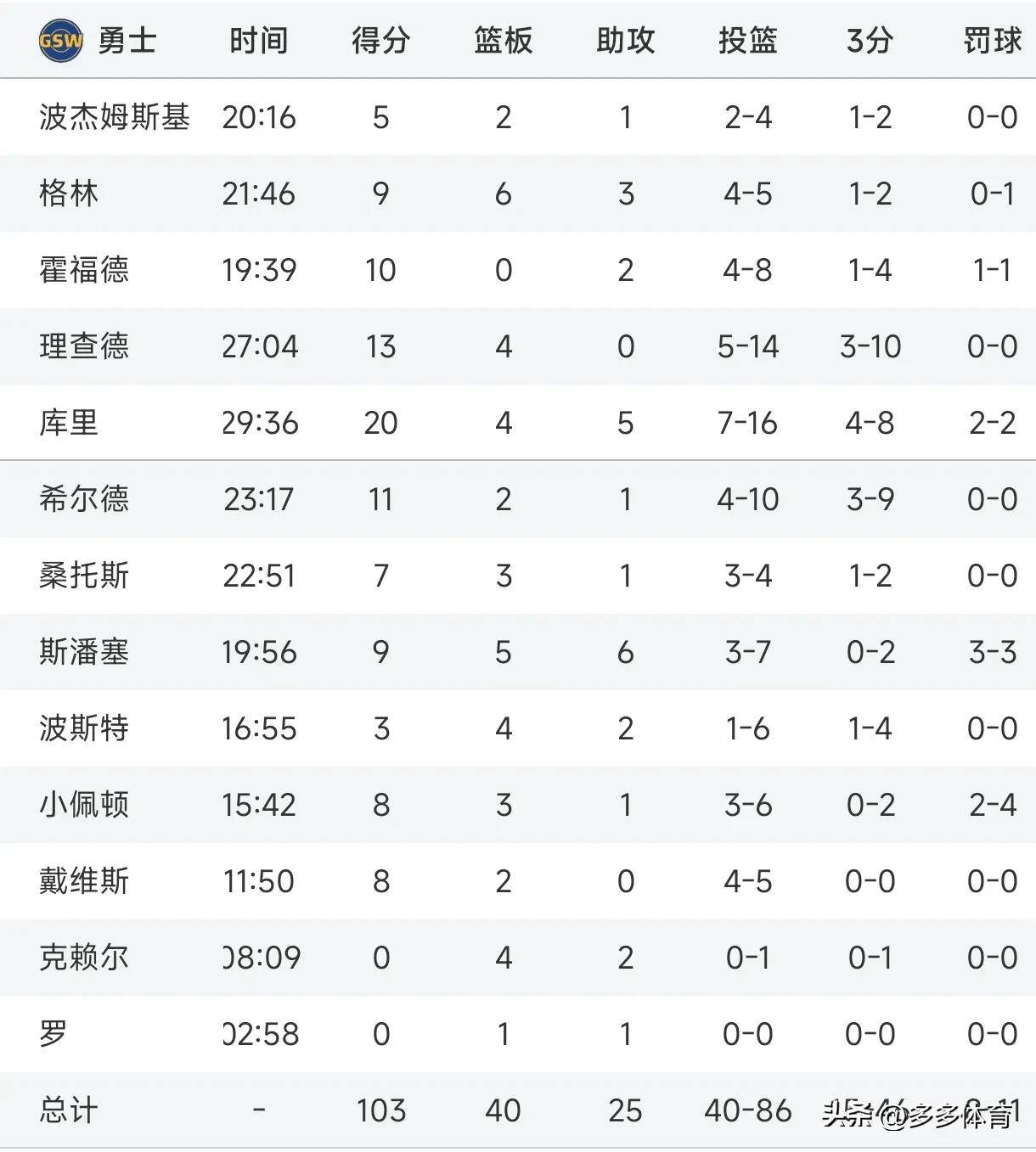 整场比赛,勇士的表现显得有些疲软,缺乏活力。基本上,全队得分大多依赖库里,其他球员的表现未能起到关键作用。尽管霍福德、格林和佩顿表现不错,但球队的其他年轻球员并没有得到有效发挥,像波斯特、戴维斯和波杰等人的表现尤其令人失望。
