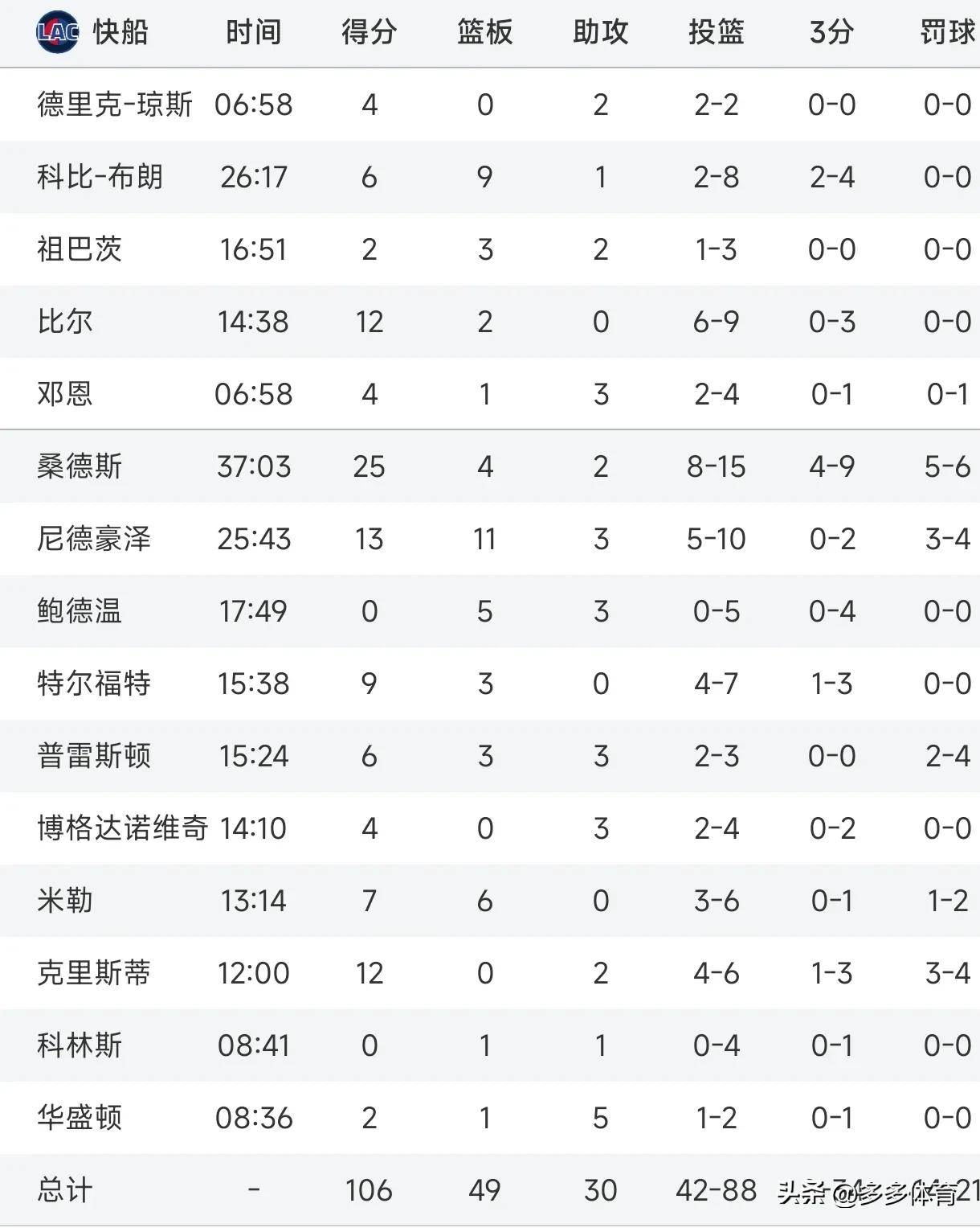 下半场,快船继续保持领先,最终以106:103击败勇士。尽管哈登、小卡、保罗和洛佩斯缺席,快船依然在场上展现出强大的战斗力。勇士大部分时间处于落后状态,尽管缺少了巴特勒和库明加,但整体表现依然不理想。